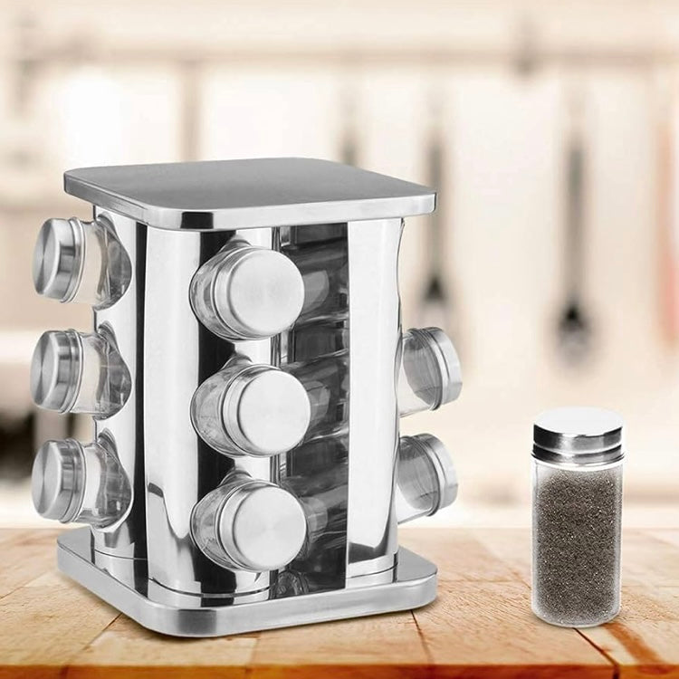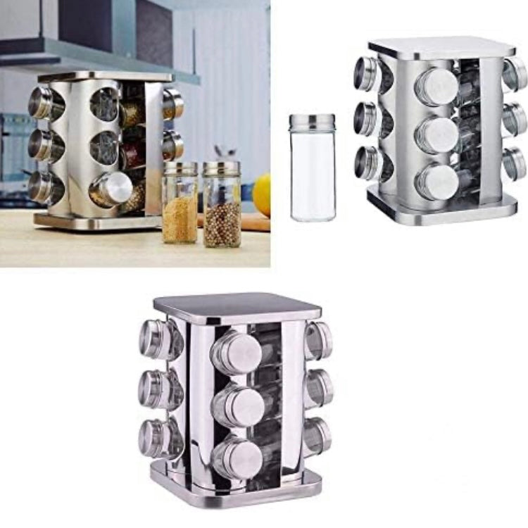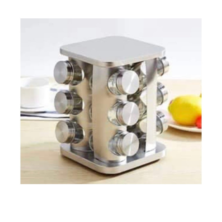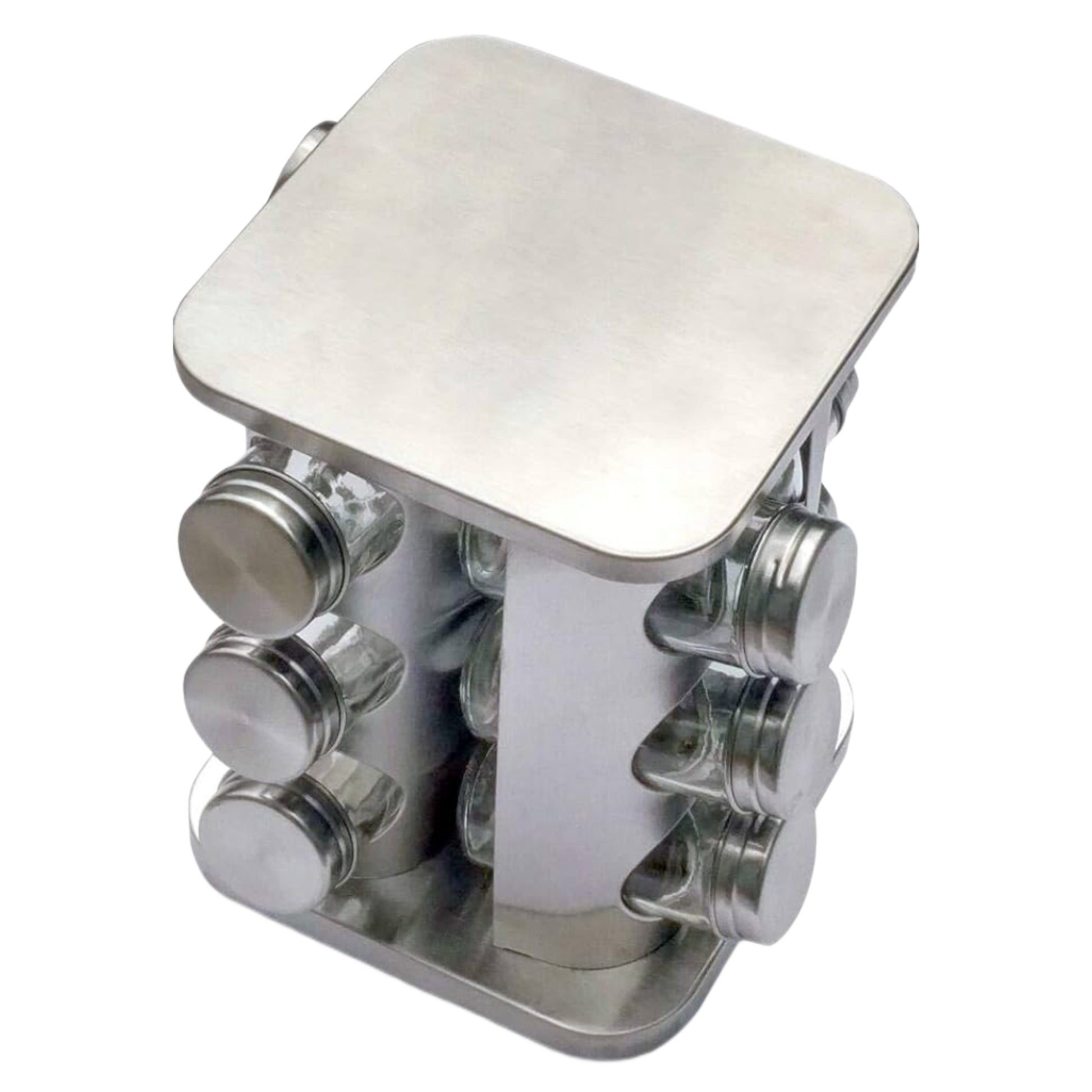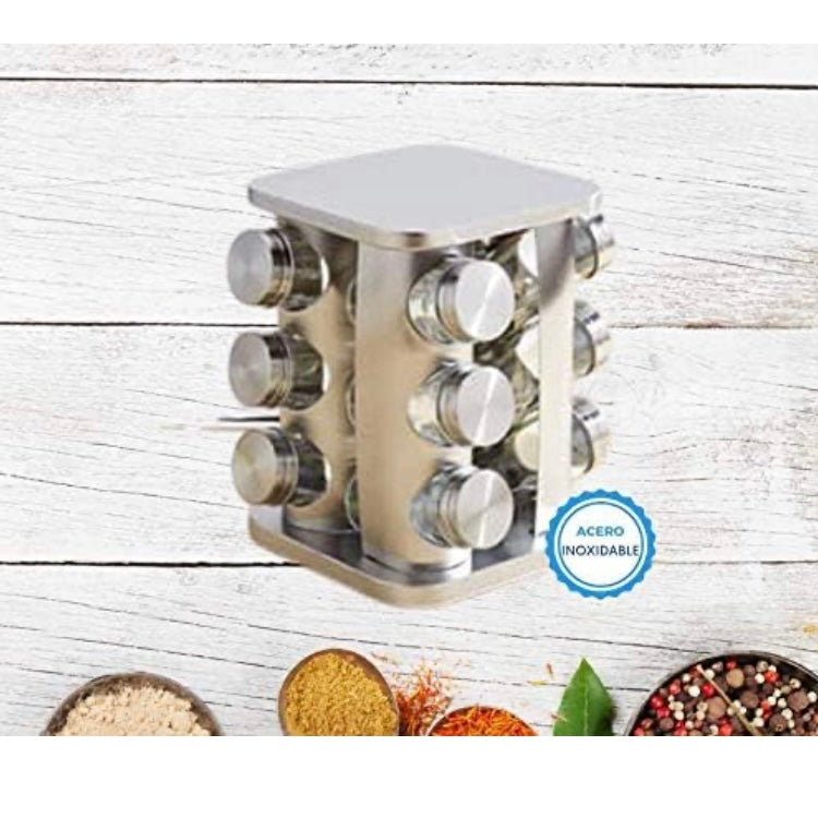 Especiero giratorio de acero inoxidable 12 frascos de vidrio y base giratoria