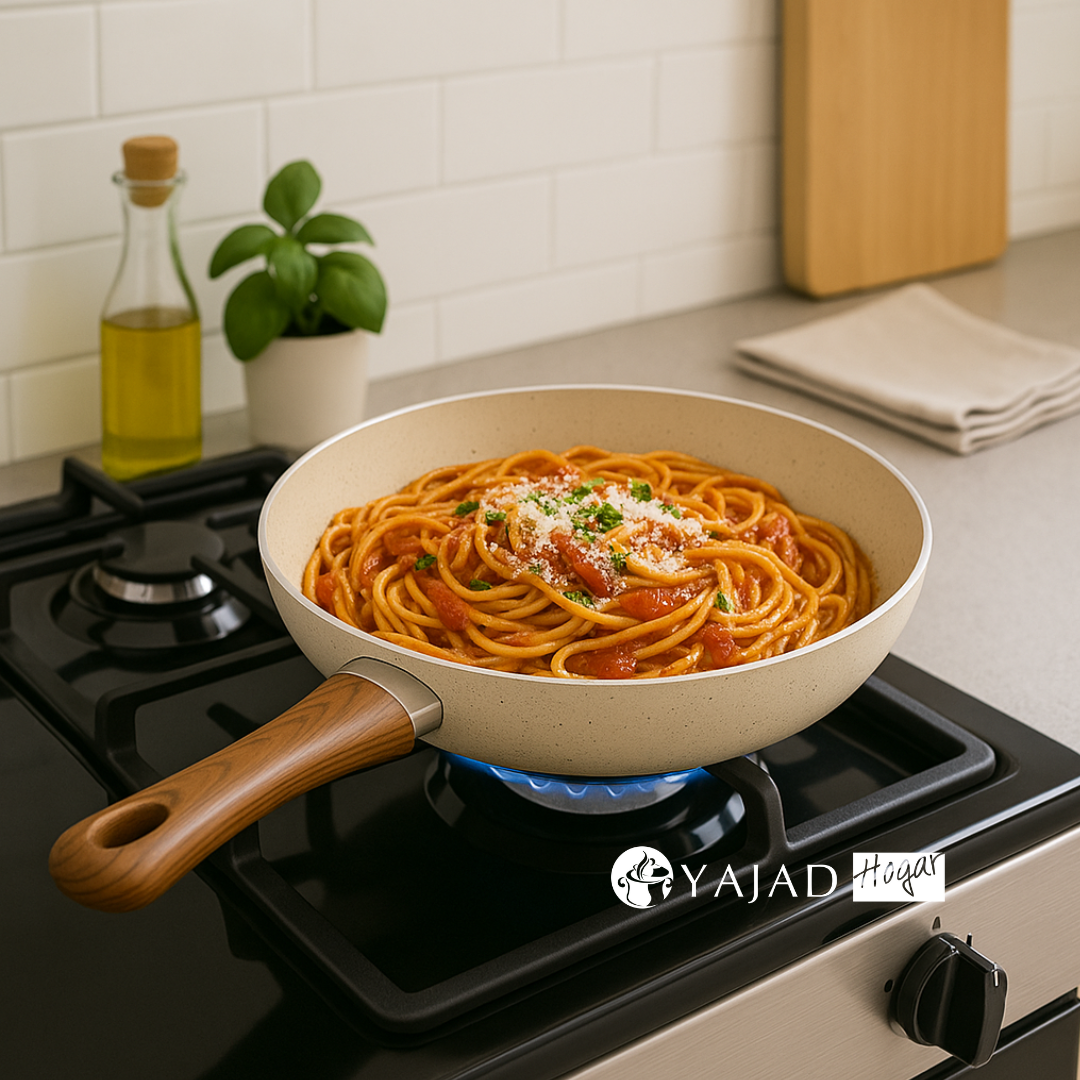Yajad Hogar – Sartén Antiadherente de Mármol Color Beige Capuchino de Aluminio, 20 cm | Mango Ergonómico de Baquelita | Compatible con Estufas de Gas y Eléctricas | Libre de PFOA (Copia)